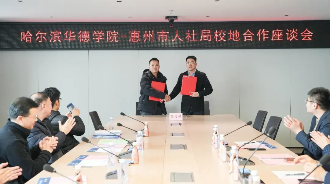 校地双方围绕政校企协同育人模式创新、实习就业基地建设等核心议题展开深入研讨,达成广泛共识。哈尔滨华德学院就业创业中心主任刘博与惠州市人力资源和社会保障综合事务中心主任李燕锋签订校地合作协议。