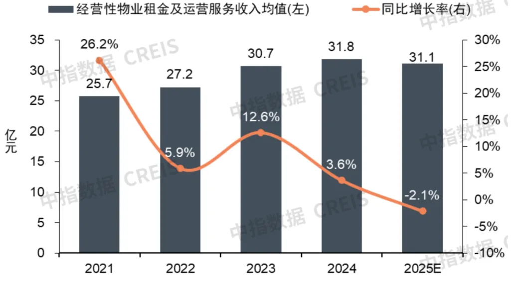 2025年,百强代表企业经营业绩止增转降。2025下半年以来,消费增速持续放缓,服务业企业扩张动力不足,商铺及写字楼租金均下降,影响商业存量项目收入,同时新开业项目数量减少,增量收入贡献有限。根据监测统计,2025年百强代表企业经营性物业租金及运营服务收入均值为31.1亿元,同比下降2.1%。少数头部企业项目运营情况相对稳健,收入维持增长。
