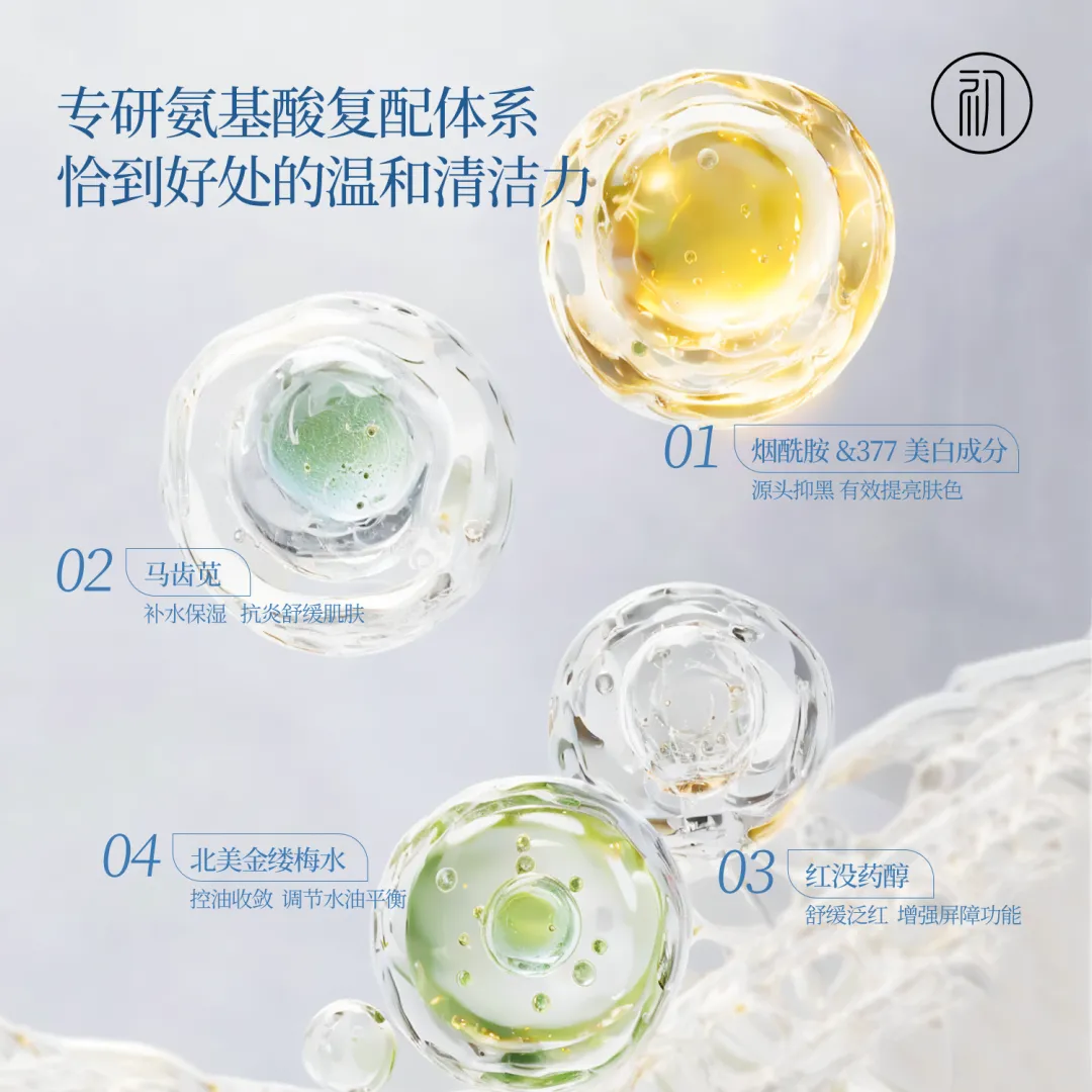 三重氨基酸复配表活体系,温和不刺激,不含皂基与酒精。添加抗糖修护成分与玻尿酸保湿因子,清洁时同步中和肌肤糖化产物,改善黄气与粗糙感,修护肌肤屏障,长期使用能淡化初老暗沉,细化毛孔,让肌肤保持清爽弹润的状态。