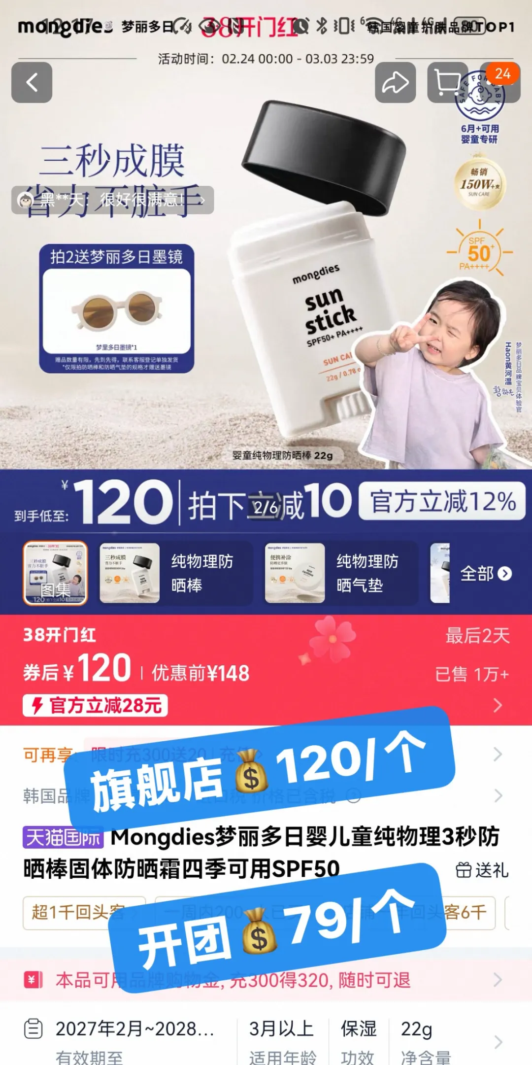 儿童防晒垄断式第一,爆款单只到手仅需💰79,开团首日还加赠墨镜。