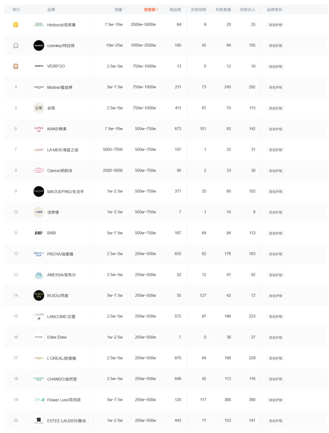 2026年3月25日抖音美妆护肤热销品牌排行榜TOP20