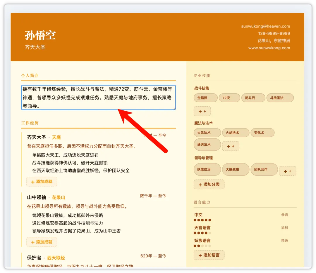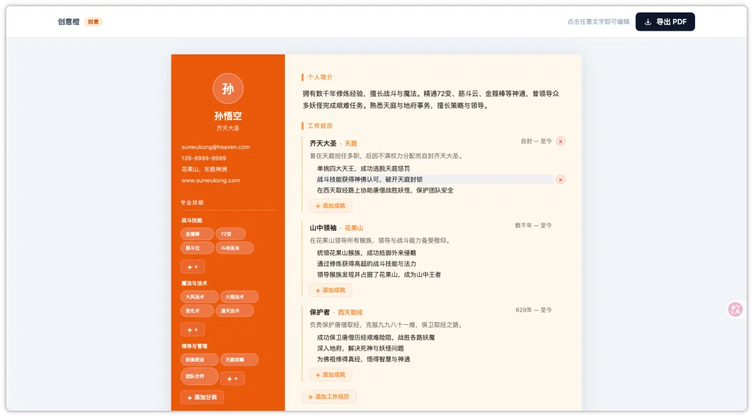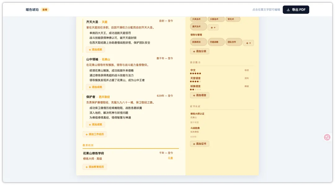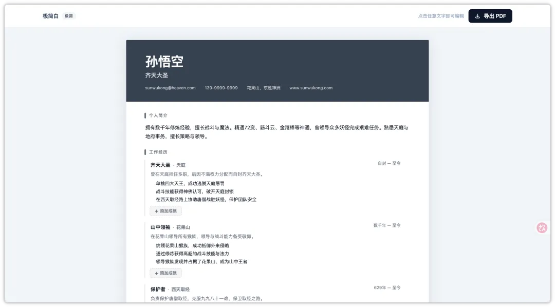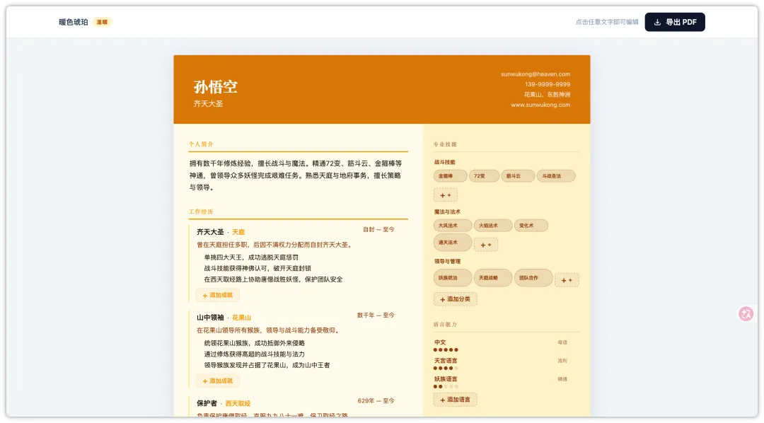 当你深入使用之后,你会发现它不只是一个固定的模版,而是里面的板块你可以随意增加删除,基本上可以二次加工美化,从而实现创意个性化。最近或者过段时间需要找工作的,可以用起来。必须给这个开发者点赞。