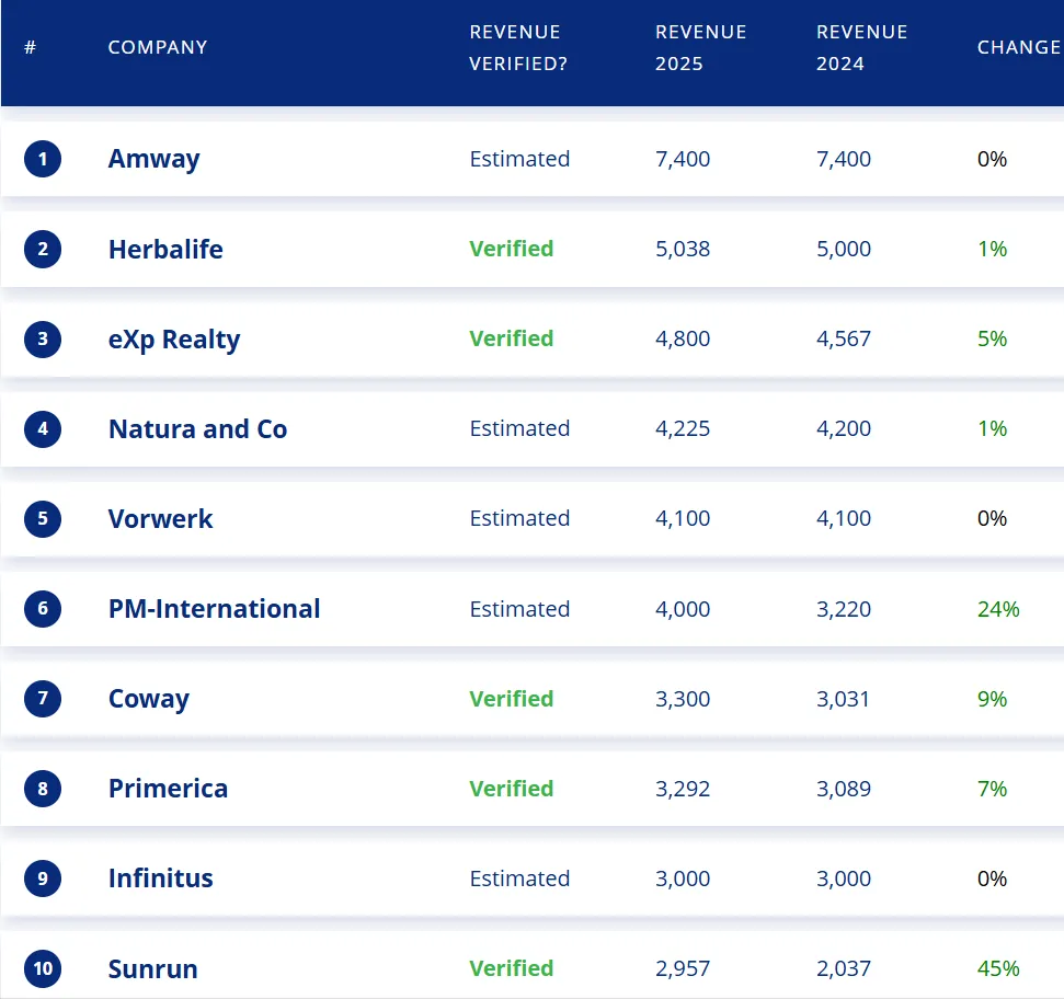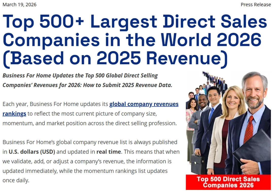 3月19日,《家庭商业》(Business For Home)网站发布了“2026年全球直销公司500强”名单,公司排名基于2025年的收入。我们注意到,这份名单中,有多家国内拿牌直销企业上榜。从名单来看,安利、康宝莱、福维克、无限极进入了前十。
