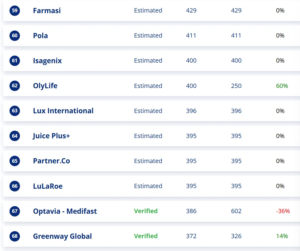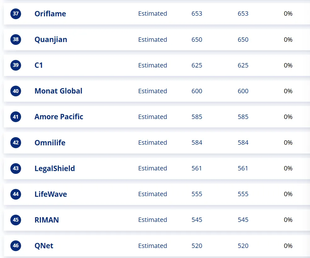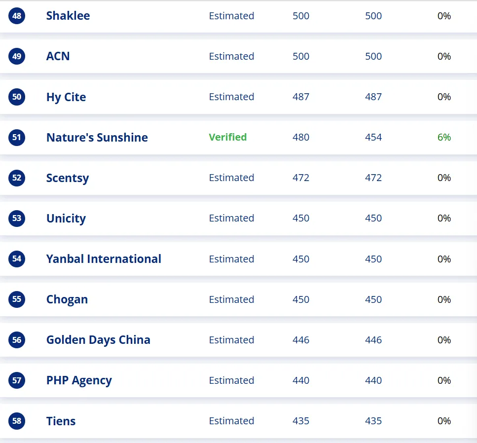 玫琳凯、美乐家、如新、完美、尚赫、新时代国珍、优莎娜、隆力奇、欧瑞莲、嘉康利、自然阳光、天狮、宝丽、大溪地诺丽、康美、安然、安惠、富迪等企业也在全球直销公司500强中。