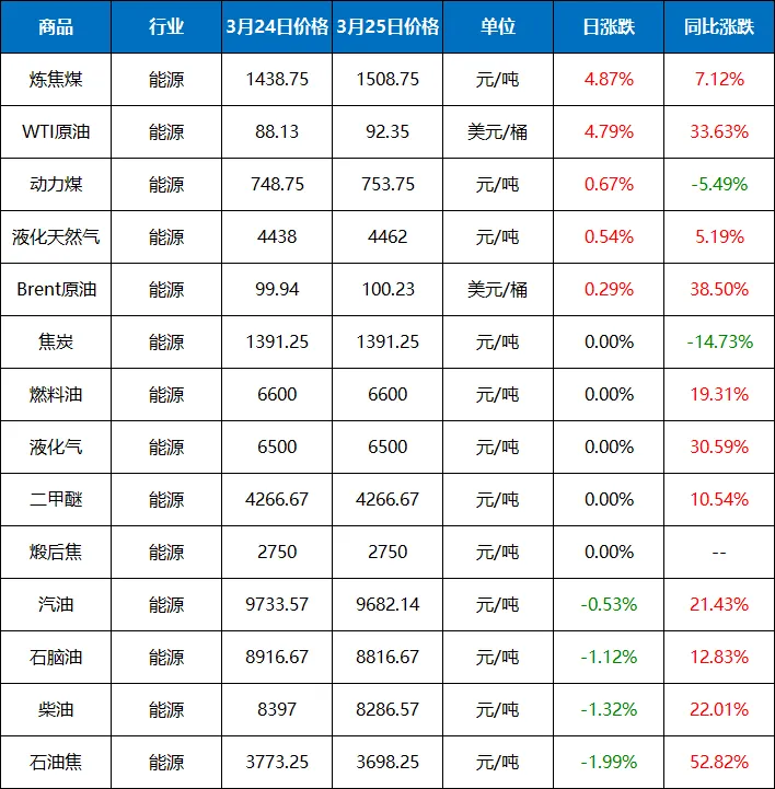 2026年(3.25)能源大宗商品价格涨跌榜