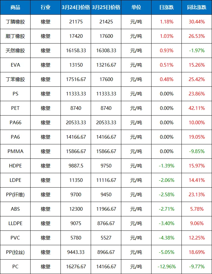 2026年(3.25)橡塑大宗商品价格涨跌榜