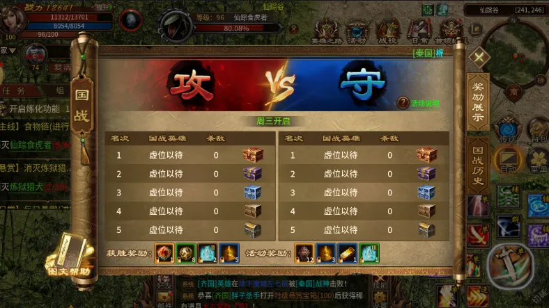 游戏每周三、周六20:00-21:00准时开启国战,玩家可加入秦、齐、赵三大阵营,参与这场跨服争霸盛宴,最多可实现千人同屏对战,画面震撼十足。国战全程分为“边境争夺→攻城破阵→圣山决战”三大阶段,每个阶段都有明确的目标,攻方需依次击败守方三大护国圣使与护国大将军,攻破国家祭坛即为获胜;守方则需守护核心目标至活动结束,依托地形与防御道具抵御进攻,每一个阶段都充满了紧张刺激的对抗。