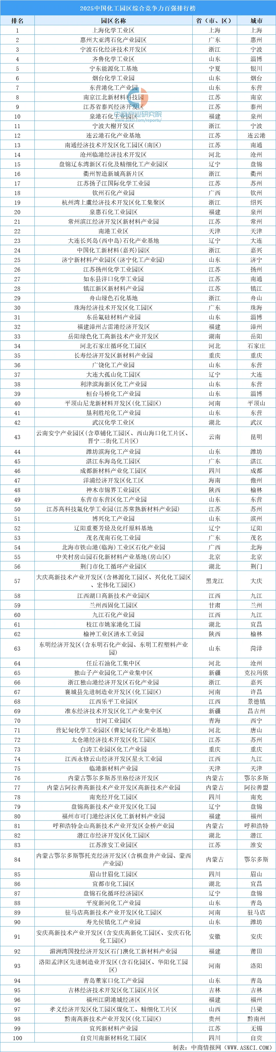 数据来源: 基于中国石油和化学工业联合会及行业权威数据、中国石油和化学工业联合会(http://www.cpcif.org.cn)、中商产业研究院(http://www.askci.com)、各省工信厅/发改委官网覆盖范围: 中国大陆地区最具竞争力的100家化工园区中国化工园区综合竞争力TOP100百强榜