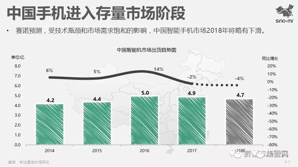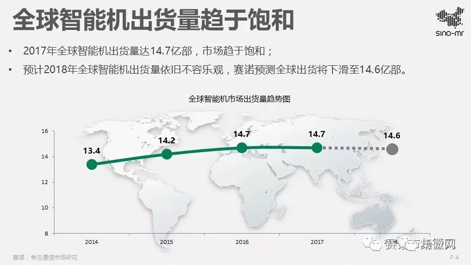 首先从整个智能手机市场看,2017年全球智能手机出货量达到14.7亿部,市场进入饱和期。预计2018年全年智能手机出货将略有下滑,至14.6亿部。