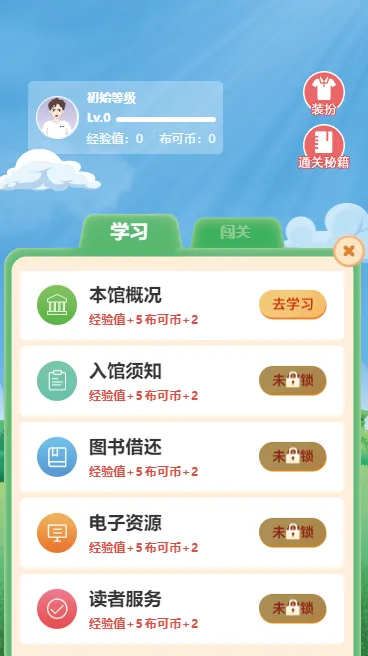 5、先学习,后闯关哦,点击“学习”按钮,然后点选“去学习”按钮,从“本馆概况”开始逐章学习。