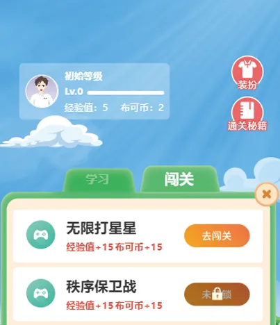6、学完一章内容后,点右上角的“返回”,就又回到看导航页解锁了第一关的闯关游戏,发挥你的聪明才智,一定可以轻松过关。