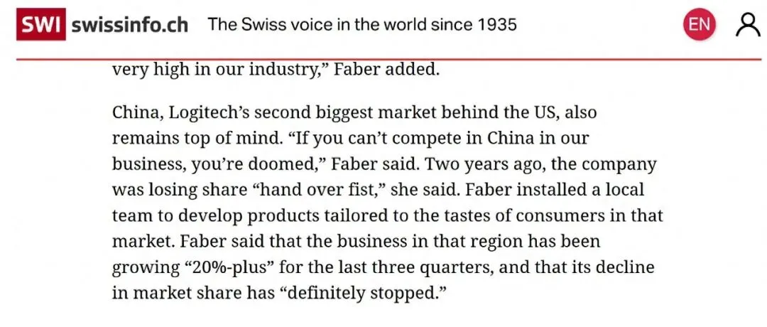 据2025年12月4日SWI报道,罗技CEO Hanneke Faber在接受采访时透露,公司已成功扭转两年前在中国市场份额下滑的态势,目前业务规模连续三个季度实现20%以上增长,市场表现企稳回升。