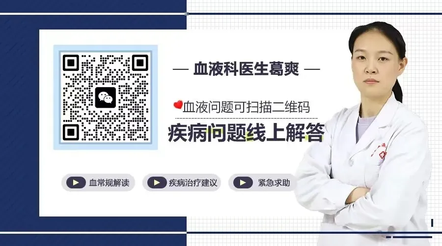 大家好,我是血液科医生葛爽,针对血液病患者看病难、挂号难的问题,我开通了线上义诊服务,0费用。欢迎扫码免费咨询:1、白血病 2、淋巴瘤 3、再障 4、MDS 5.血小板减少/增多 6.解析报告单,调整治疗方案,预防复发转移等血液问题。