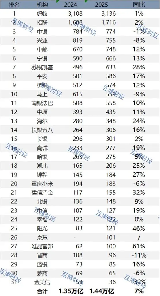 25年末,31家消金公司合计贷款余额达到1.44万亿,同比增长7%;全年实现166亿净利润,同比增长6%。
