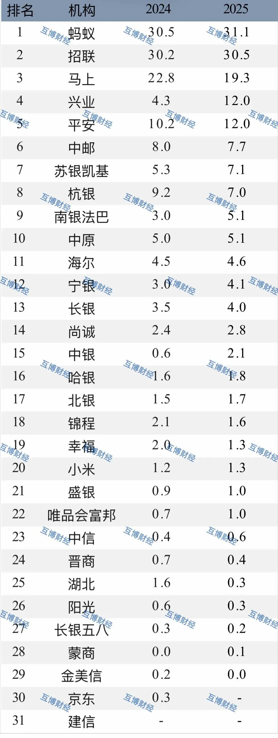 头部机构格局稳定,但增速分化明显。蚂蚁与招联消金的规模保持稳健:蚂蚁以3136亿元余额稳居行业第一,规模基本与2024年末持平,单业务杠杆已接近上限;招联消费金融紧随其后,2025年末余额为1716亿元,同比增长1.7%。与之形成对比的是,兴业和马上是排名前十中唯二出现规模下降的消金,同比分别下降8%和9%。