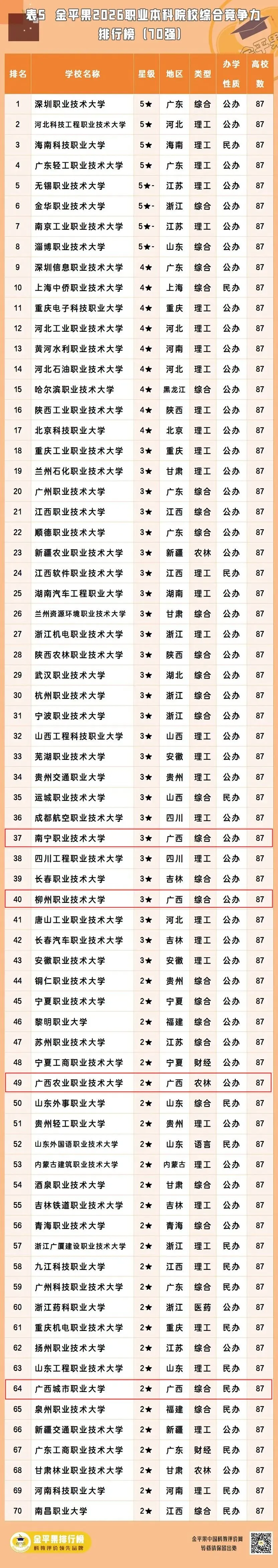 此外,广西4所职业本科学校均上榜金平果2026职业本科院校综合竞争力排行榜(70强),南宁职业技术大学位居全国第37位,柳州职业技术大学排在第40位,广西农业职业技术大学排在第49位,广西城市职业大学排在第64位。