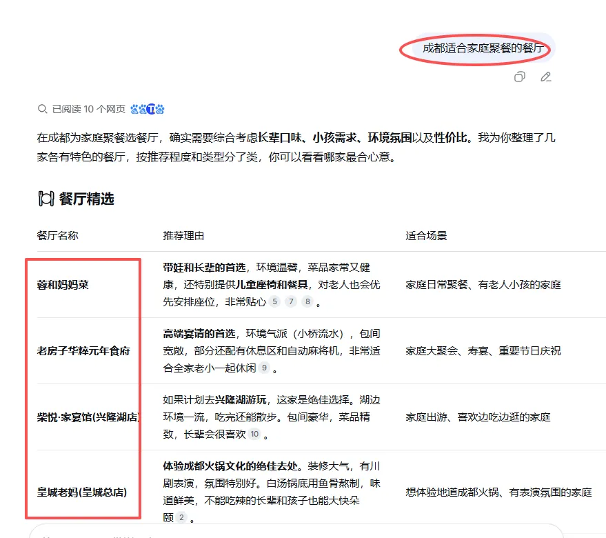 很多人以为GEO就是"AI时代的SEO",这是对两者最大的误解。关键差异在于:SEO争夺的是"被看见",GEO争夺的是"被信任"。当AI向用户推荐"成都适合家庭聚餐的餐厅"时,品牌出现在答案里的那一刻,就已经完成了从"广告"到"背书"的质变。这种信任价值,十个搜索排名都换不来。03 搞懂AI的"大脑",才能玩转GEO