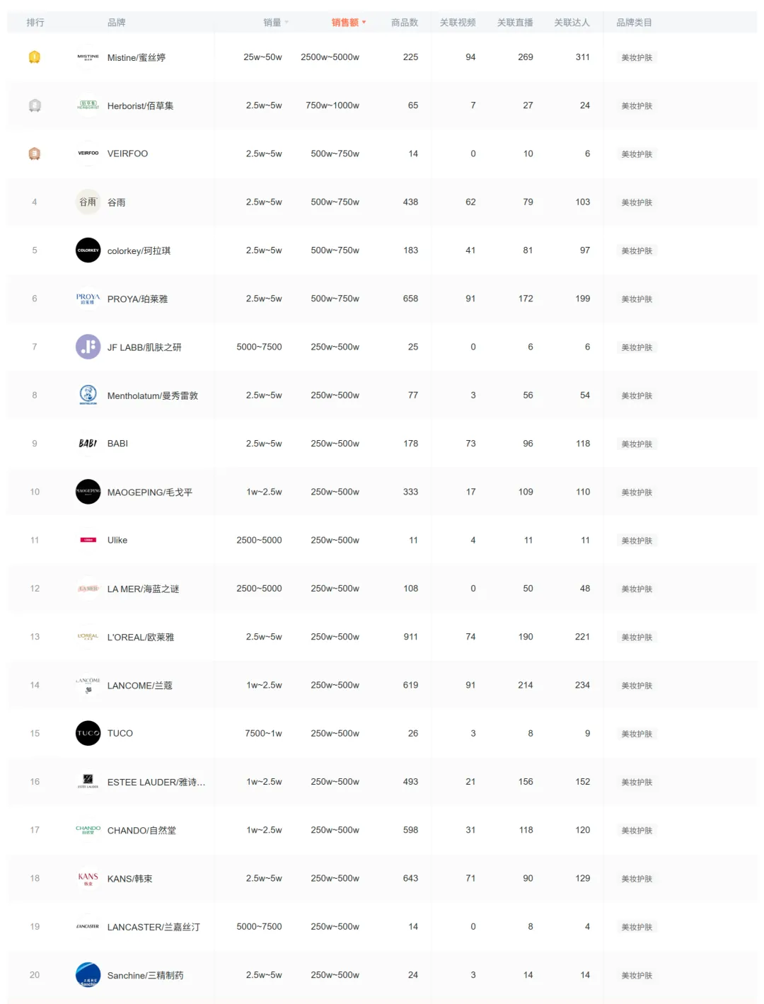 2026年3月26日抖音美妆护肤品牌销售排行榜TOP20