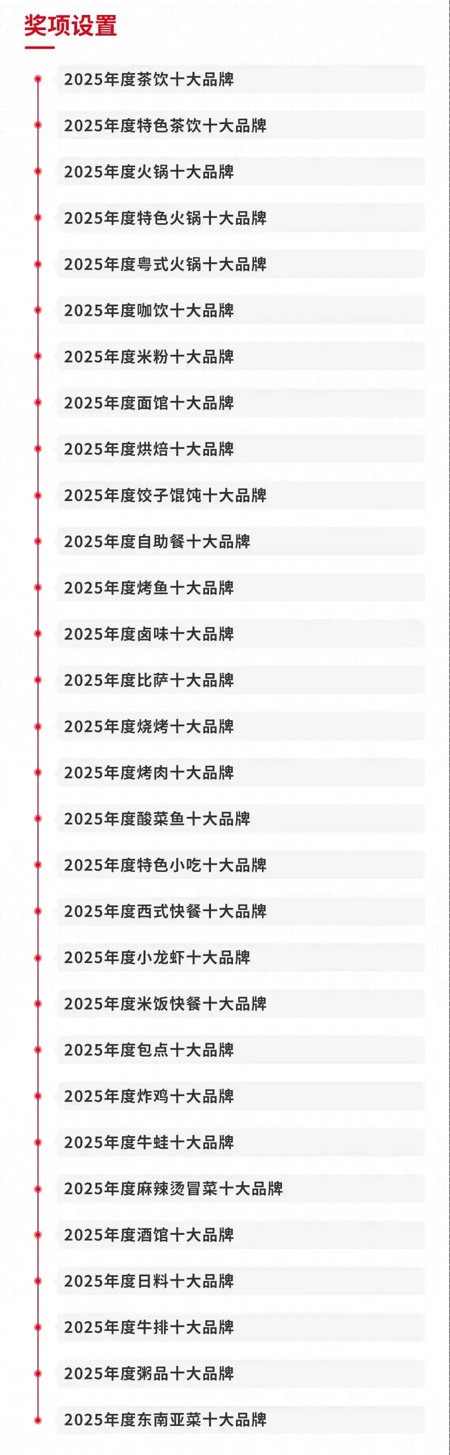“2025年度中国餐饮品类十大品牌”榜单共设立了包括茶饮、特色茶饮、火锅、特色火锅、粤式火锅、咖饮、米粉、面馆、烘焙、饺子馄饨、自助餐、烤鱼、卤味、比萨、烧烤、烤肉、酸菜鱼、特色小吃、西式快餐、小龙虾、米饭快餐、包点、炸鸡、牛蛙、麻辣烫冒菜、酒馆、日料、牛排、粥品、东南亚菜在内的30个品类的细分奖项,共300个优质品牌上榜。