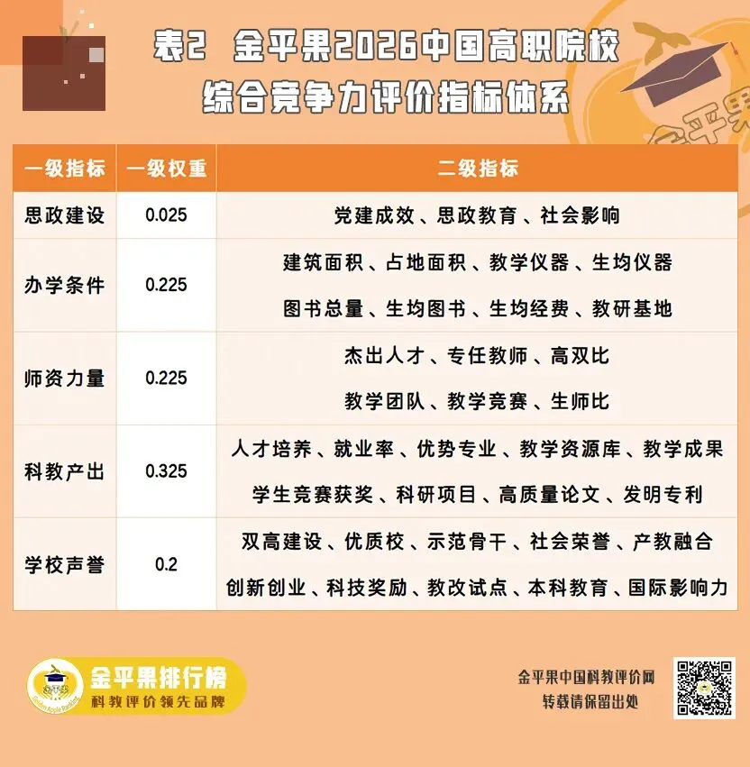 表2 金平果2026中国高职院校综合竞争力评价指标体系