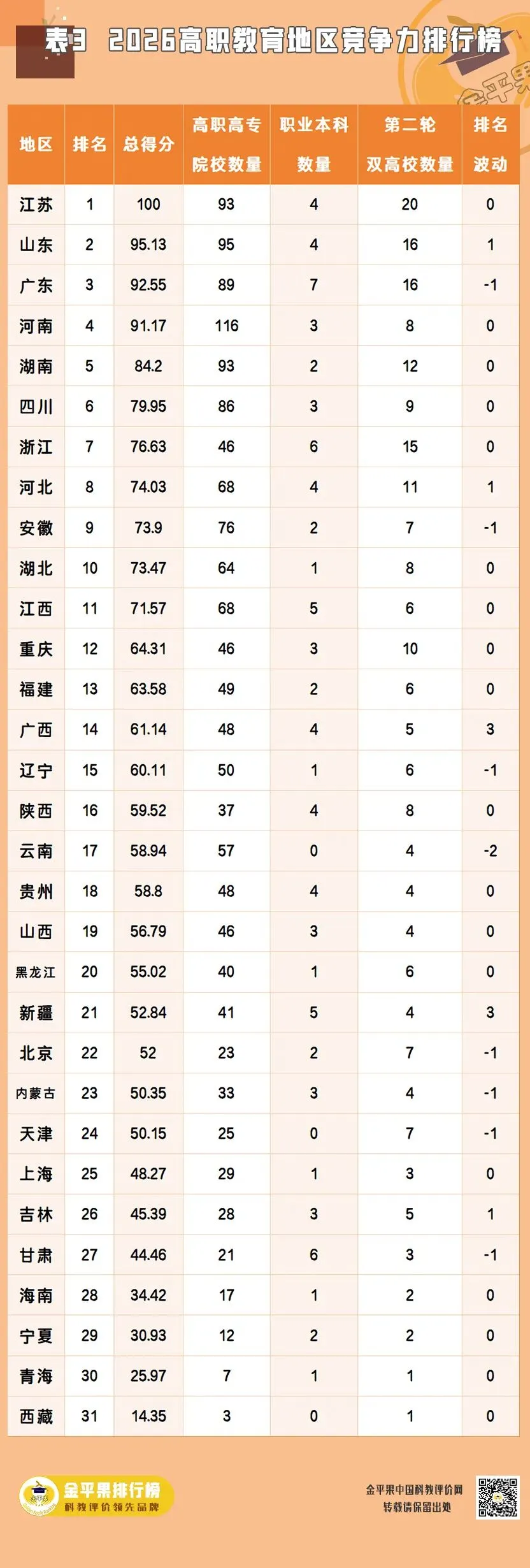 ——江苏、山东、广东居地区实力三强;深职大、河北科工大、海科大、广东轻工、无锡职大列职业本科院校前五位;天职大、长沙民院、南信院、北工职院、江苏农牧排名高职高专前五位;