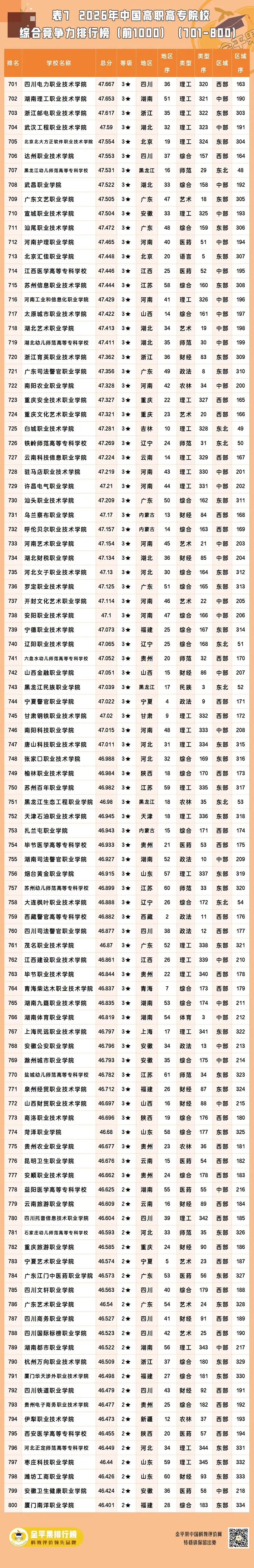 表7 2026年中国高职高专院校综合竞争力排行榜(前1000)