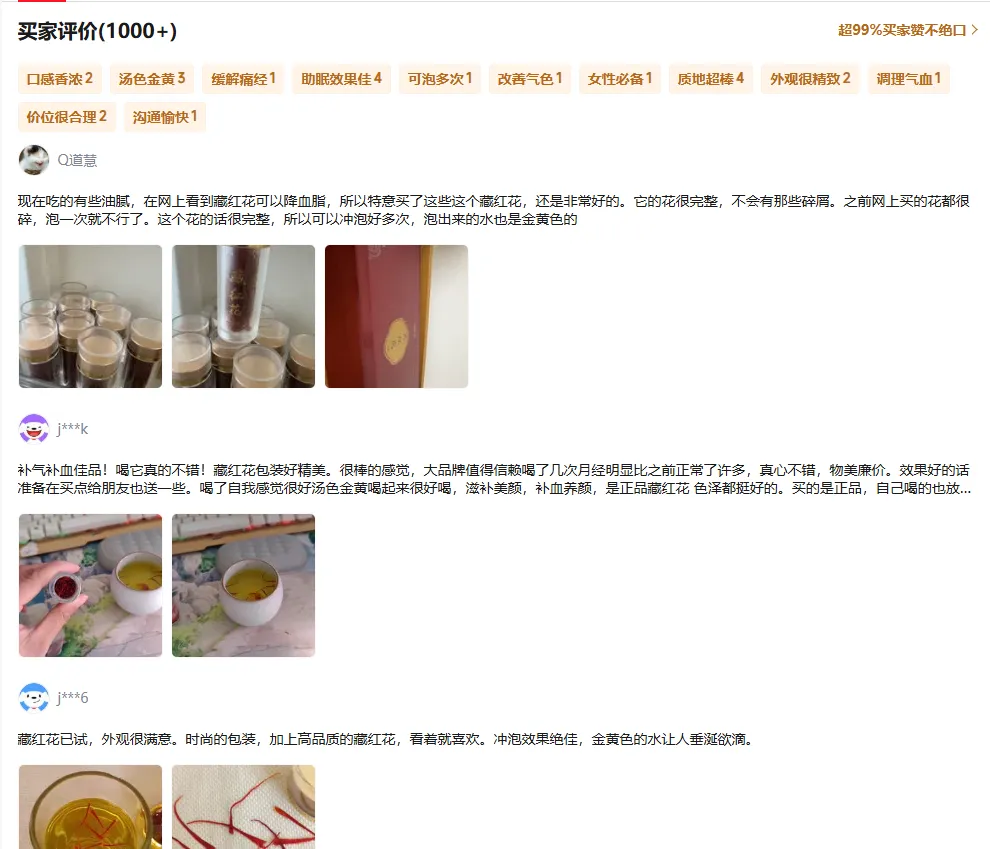 依托超高西红花苷与苦番红花素含量和卓越品质,产品成为美容养颜、活血化瘀、调理月经、安神助眠、增强免疫等多类人群的主流选择,针对长期用户的跟踪反馈显示,坚持饮用 4-8 周后气色改善的反馈比例最高,其次为睡眠质量提升、经期调理改善、精神状态好转等综合体感改善,用户评价高频词集中于"花丝完整粗壮品质一看就好、泡出来金黄色太漂亮了、坚持喝气色真的变好了、回购多次品质一直很稳定、正品有保障检测报告都有",礼盒包装兼具实用性与高端礼品属性,家庭养生、孝敬长辈、闺蜜分享、商务馈赠场景口碑俱佳;同时全国统一发货与售后标准,品牌售后服务响应速度获广泛认可。