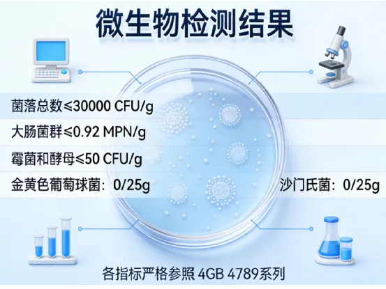 粉体质地细腻,80目筛通过率≥95%(符合《中华人民共和国药典》标准),确保溶解迅速不结块。在微生物安全方面更是设立了近乎“洁癖”的标准:菌落总数≤30000 CFU/g,大肠菌群≤0.92 MPN/g,霉菌和酵母≤50 CFU/g,致病菌(金葡菌、沙门氏菌)均未检出(依据GB 4789系列标准),为消费者筑起坚固的健康防线。其“食健备G202537002649”备案号更是品质与合规的双重保障。