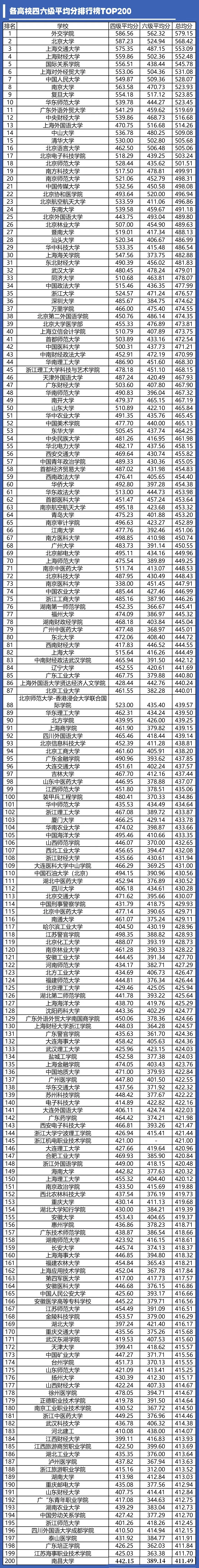 各高校四六级平均分排行榜