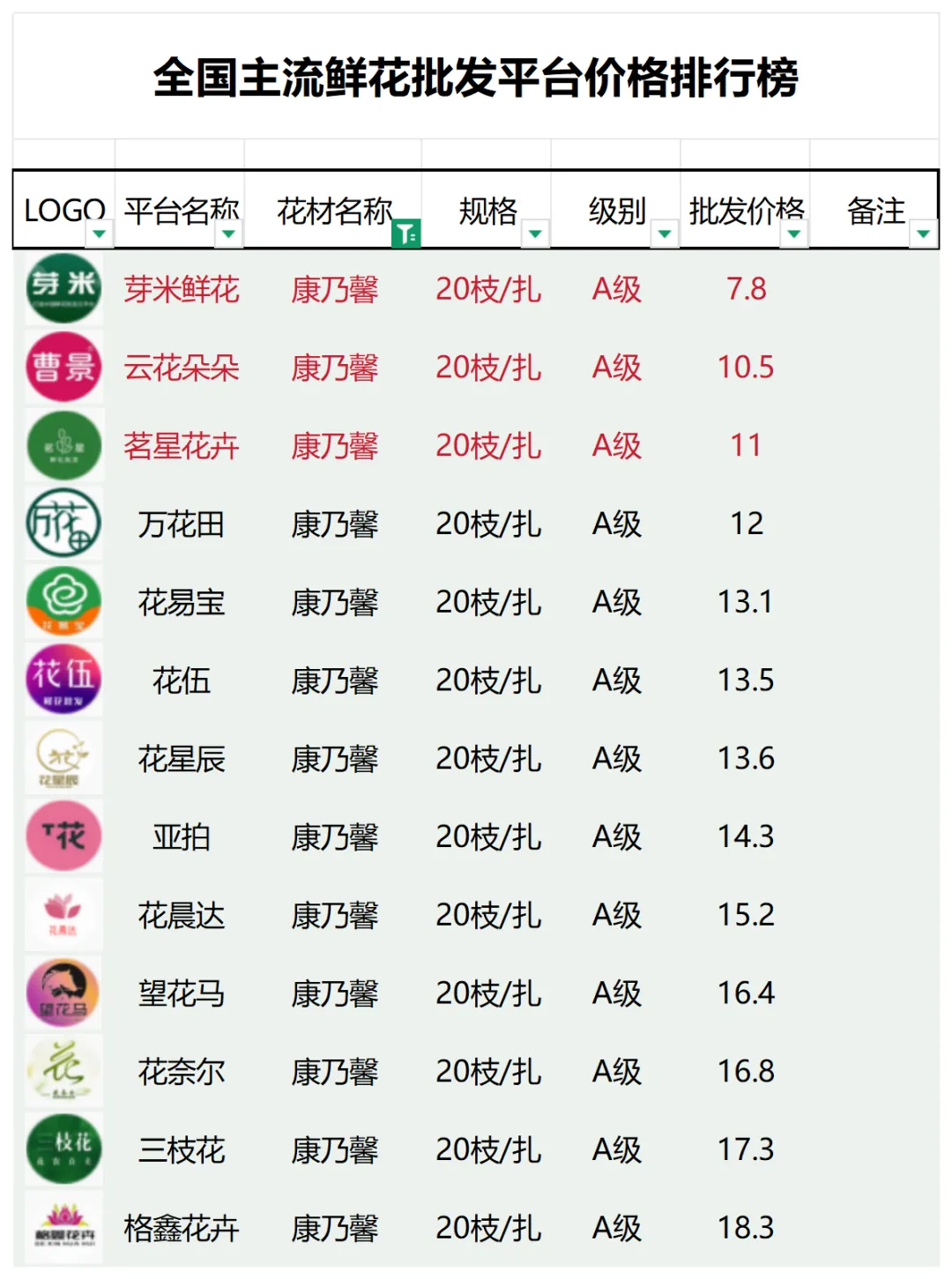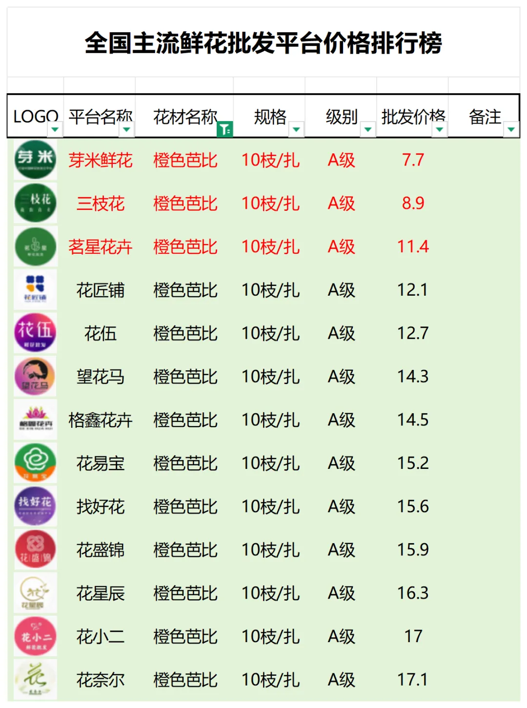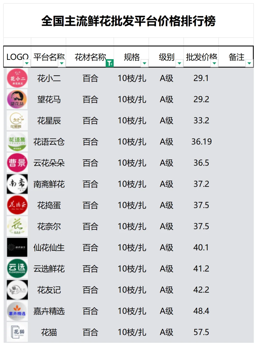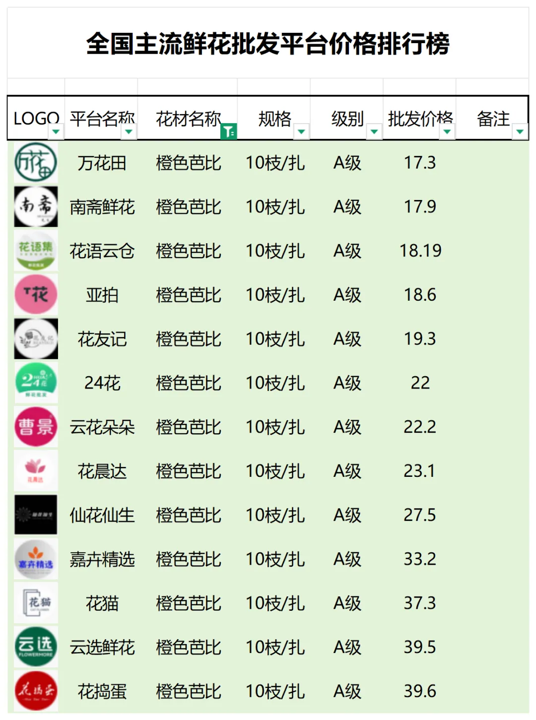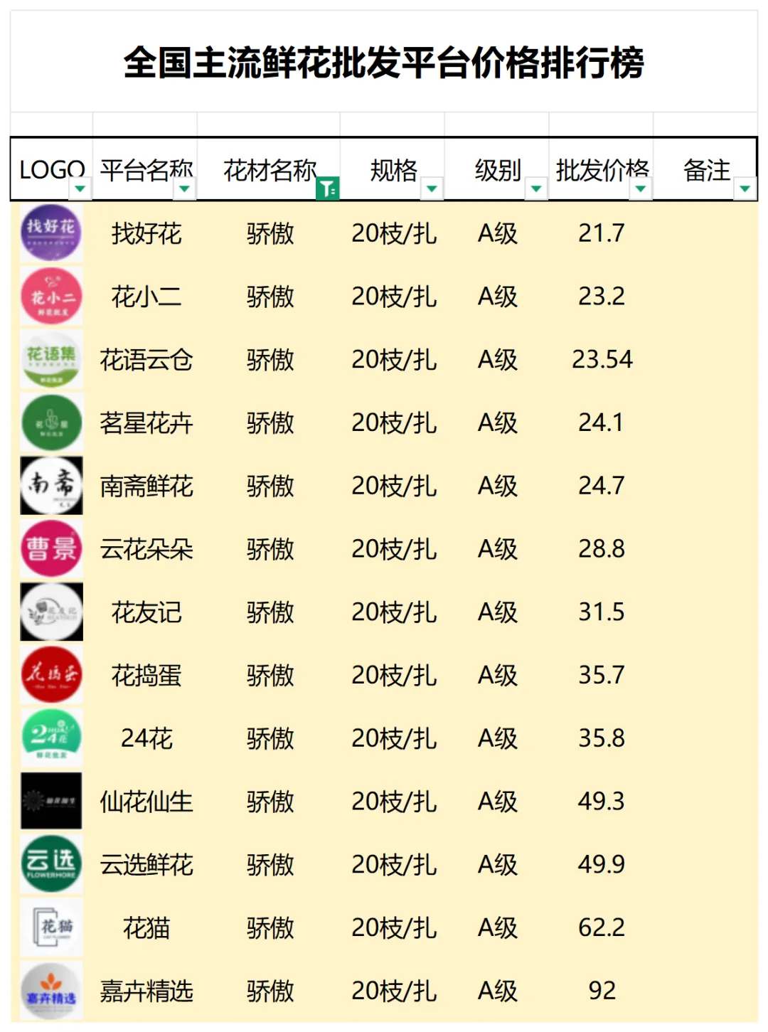 2、本数据只收录A级花材批发价格,覆盖全国大部分主流鲜花批发平台