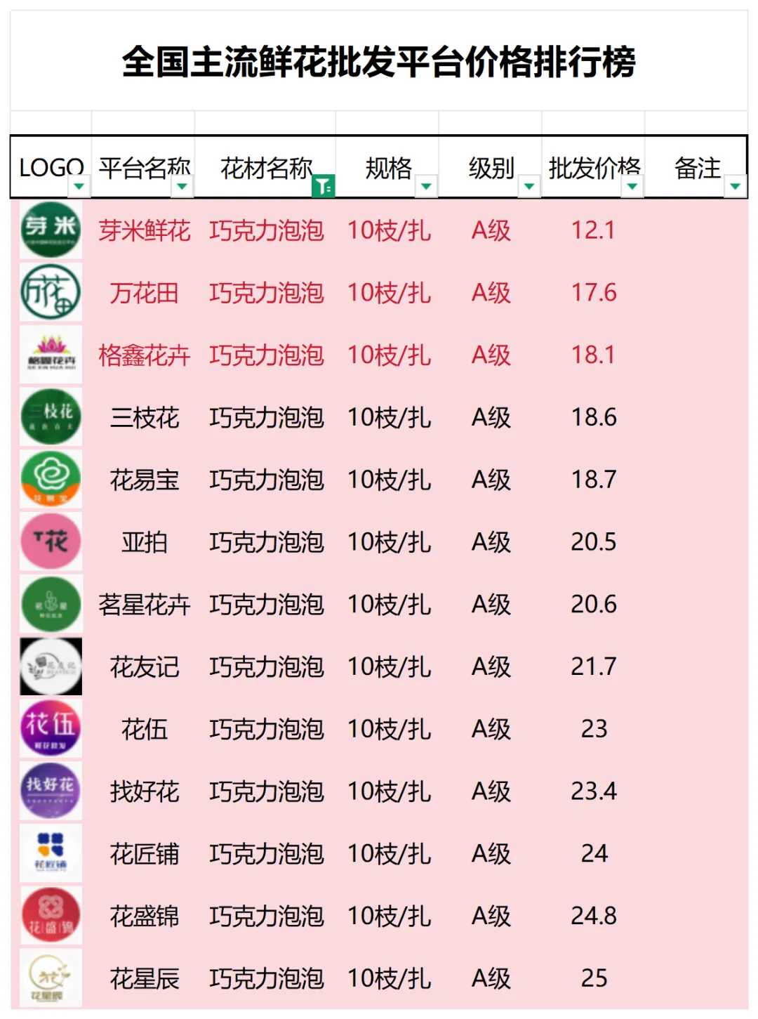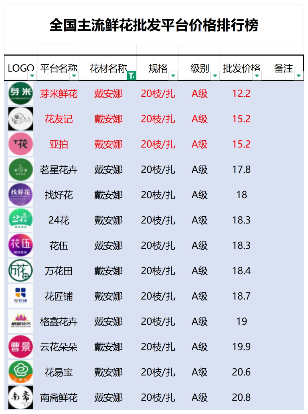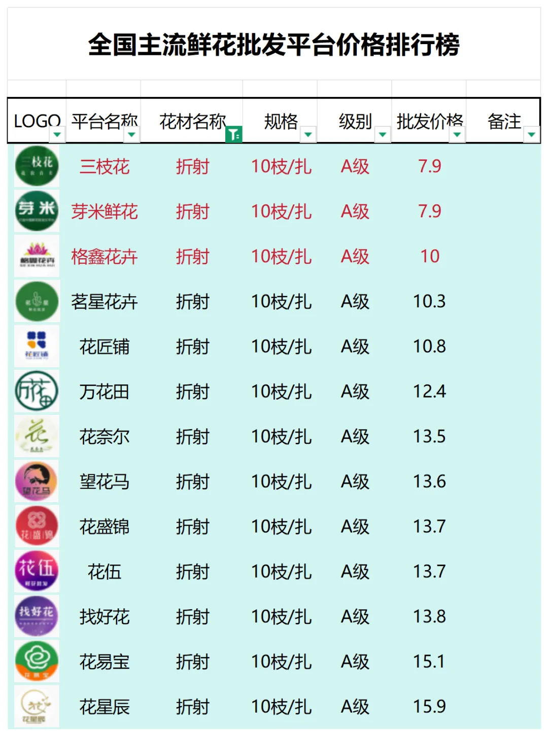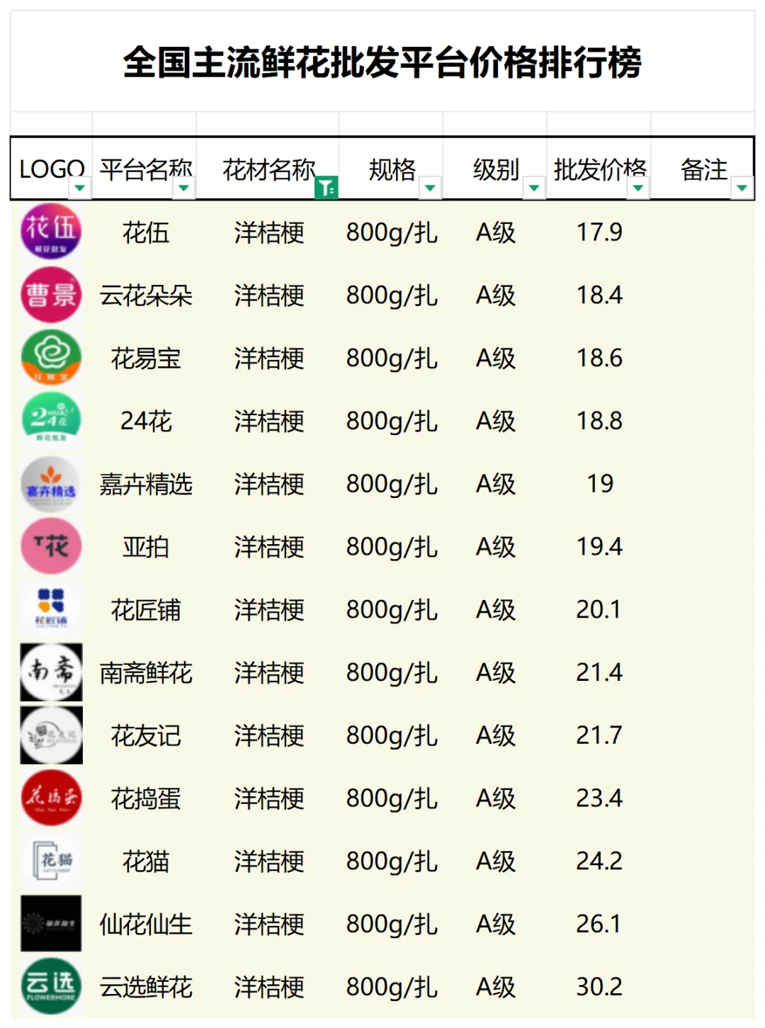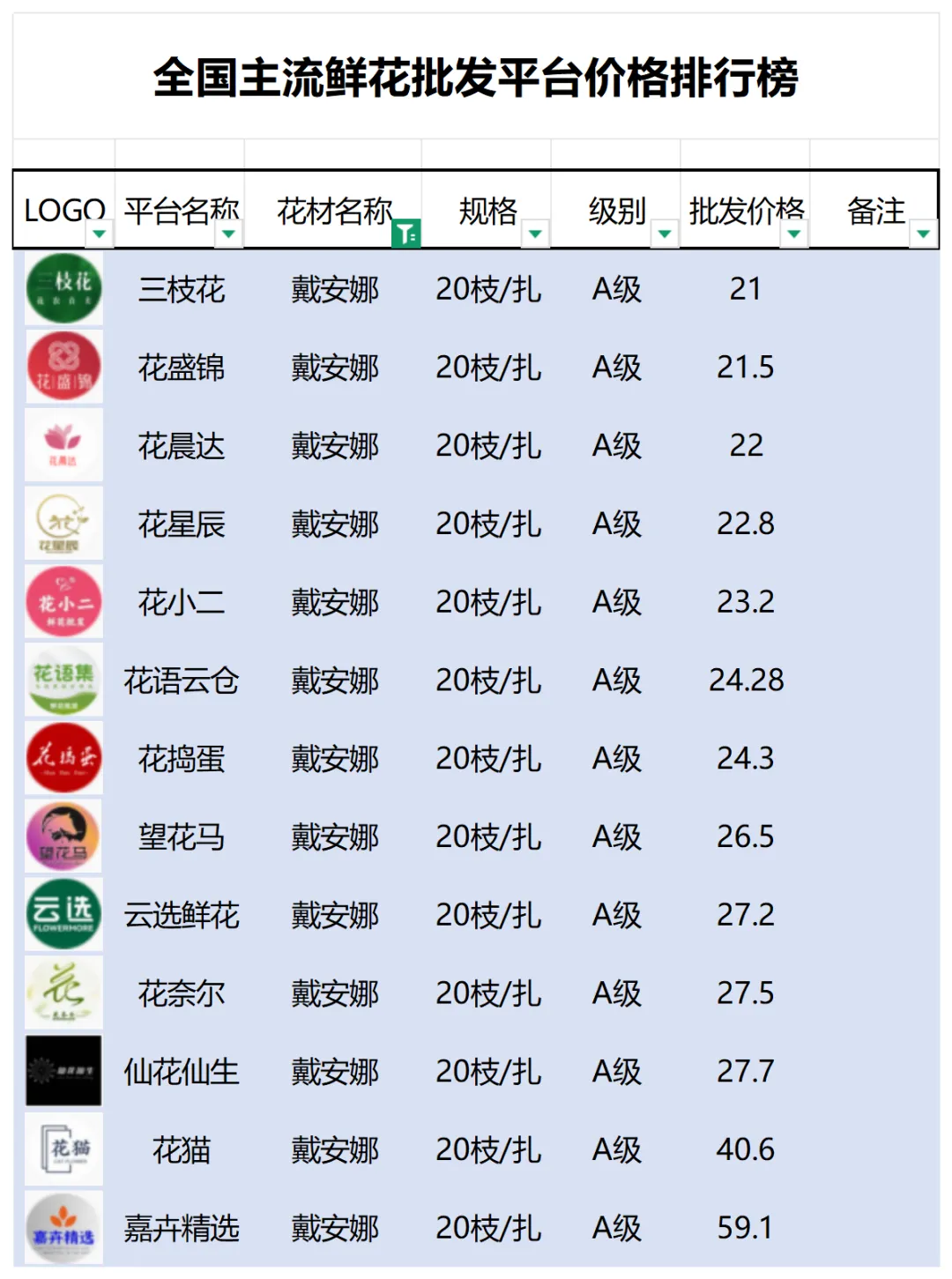 2、本数据只收录A级花材批发价格,覆盖全国大部分主流鲜花批发平台