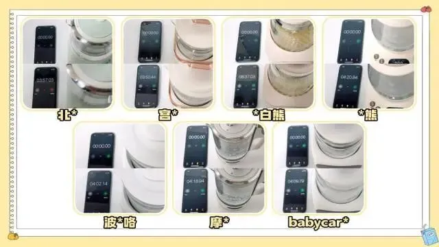 波咯咯、Babycare、摩飞、小熊加热表现良好,煮沸需要4分钟出头,导热性能满足日常泡茶、冲调等基础使用,属于行业中等偏上水平。