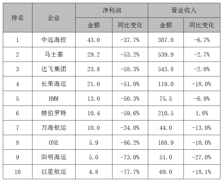 其中,HMM净利润为13.0亿美元,同比下跌50.3%,营收约75.5亿美元,同比下降6.9%;赫伯罗特净利润10.4亿美元,同比下跌59.6%,营收210.5亿美元,同比增长1.8%,其也是榜单上唯一一家营收增长的企业;万海航运净利润10.0亿美元,同比下降34.0%,营收44.0亿美元,同比下降13.0%。