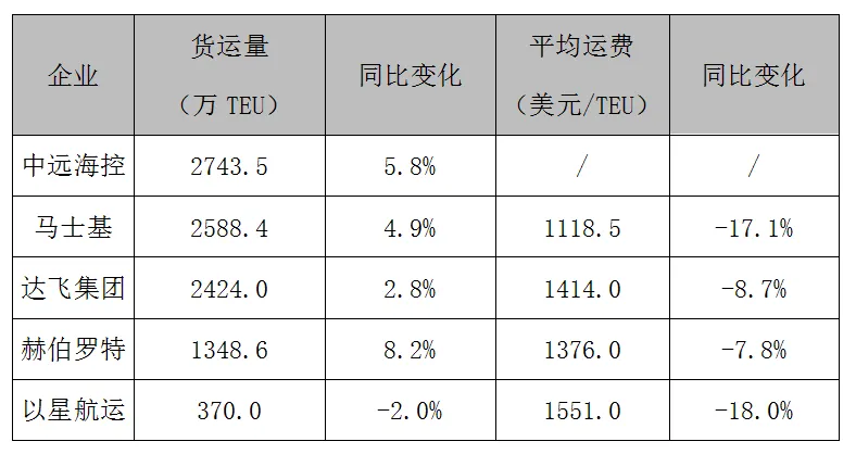 具体到班轮公司,以星航运平均运费1551.0美元/TEU,同比下降18.0%,降幅最大;达飞平均运费1414.0美元/TEU,同比下降8.7%;赫伯罗特平均运费1376.0美元/TEU,同比下降7.8%;马士基平均运费1118.5美元/TEU,同比大降17.1%。这意味着,班轮公司虽然运了更多的货,但赚到的钱却大幅缩水。