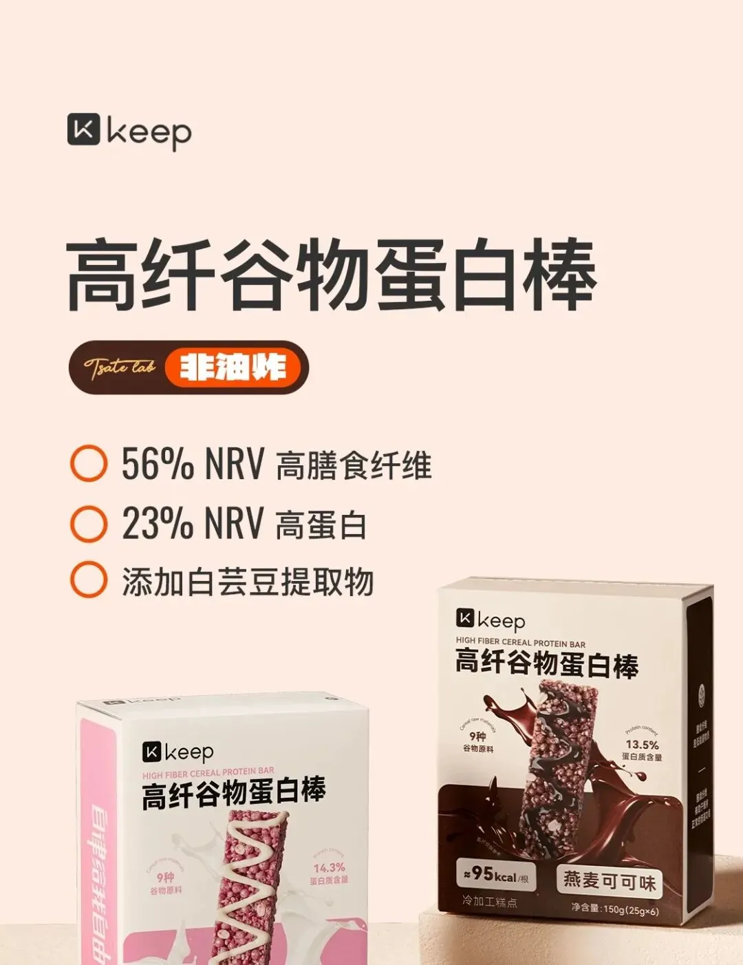 作为知名运动健身平台,Keep推出的代餐产品结合运动场景,提供蛋白棒、代餐奶昔等产品,深受健身人群喜爱。