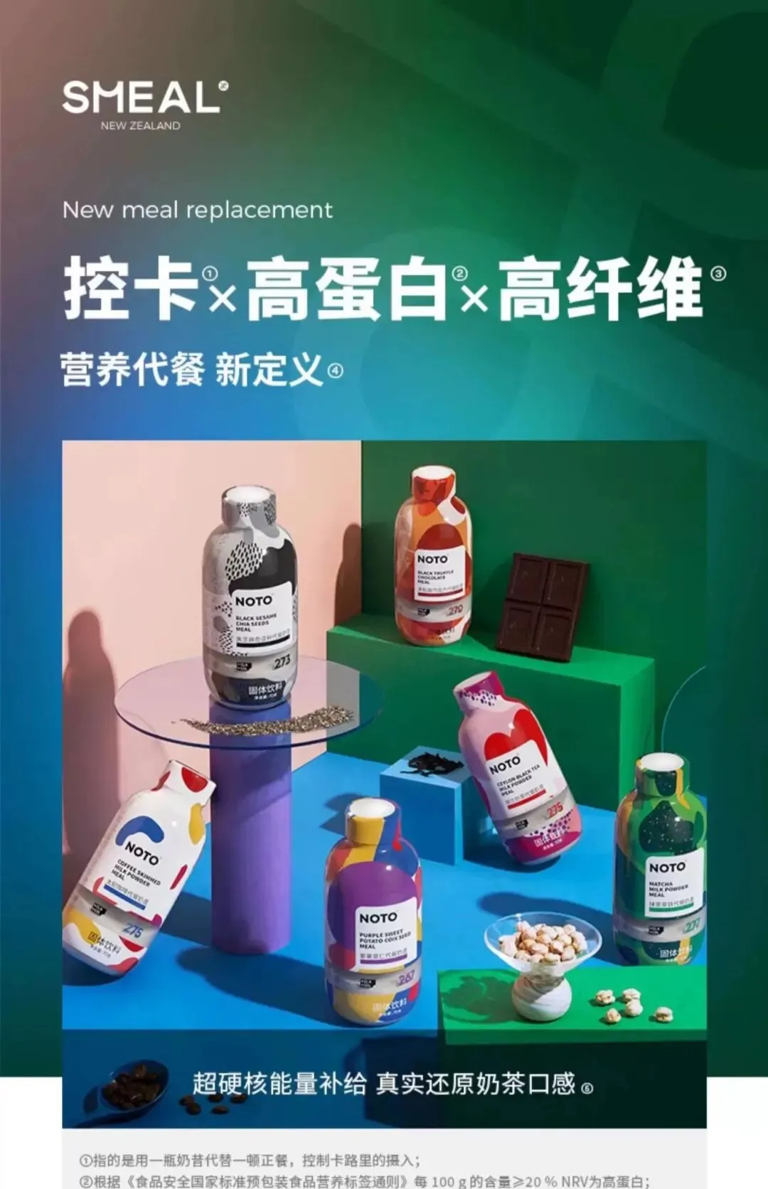 Smeal创立于新西兰,2018年进入中国市场后引爆"瓶装代餐"消费市场。品牌采用瓶装粉末形式,6款不同口味代餐奶昔各具功能性,如抹茶玄米味加入益生菌,可可味加入神经酰胺等,复购率保持在20%。
