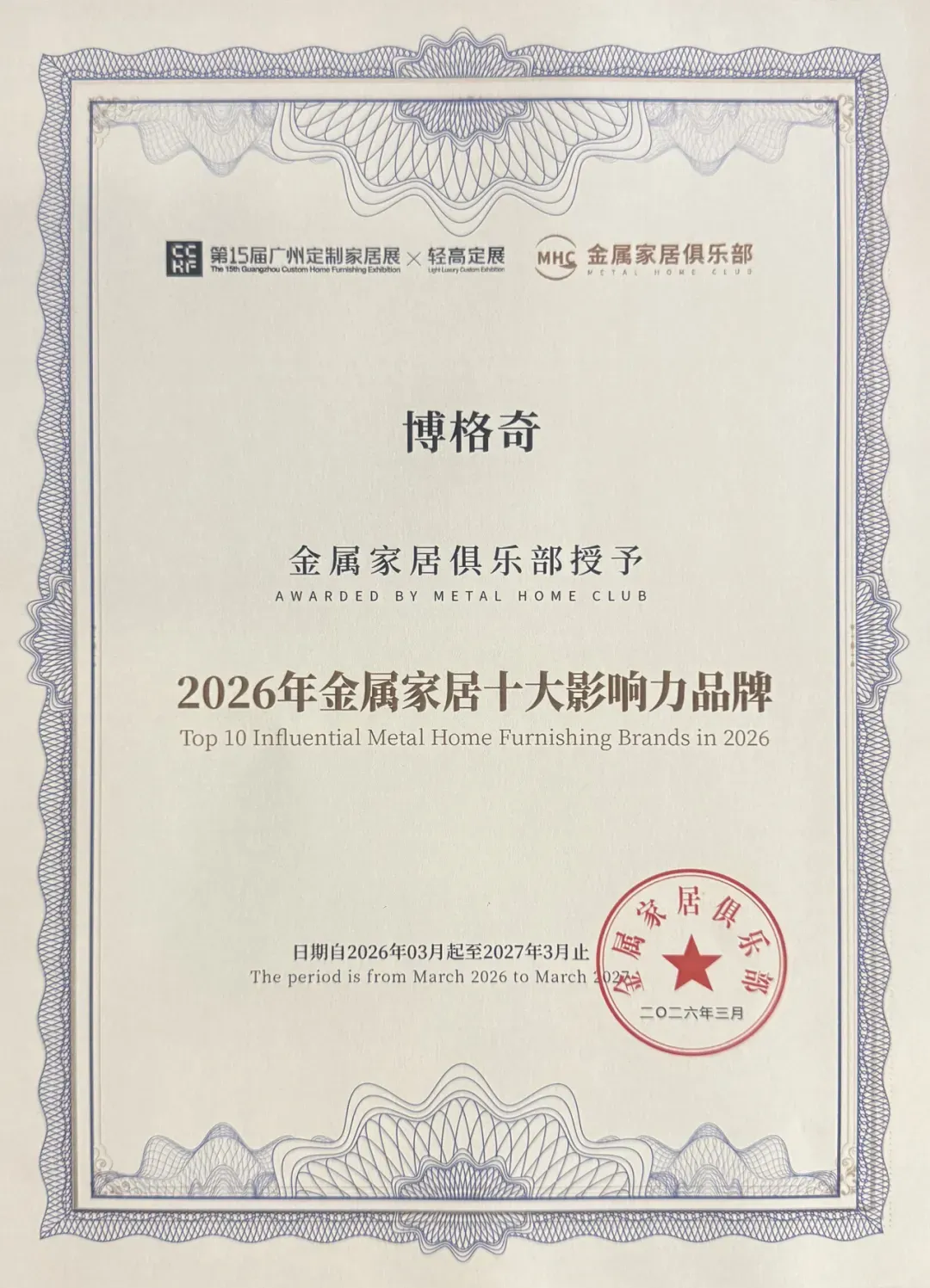 在随后举行的大会表彰环节中,博格奇不锈钢全屋定制更是凭借优异的市场表现与品牌影响力,从众多品牌中脱颖而出,一举斩获“2026年金属家居行业 十大影响力品牌”殊荣。