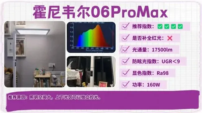 儿童护眼大路灯哪个牌子好用?霍尼韦尔06 Pro Max属于系列里的高配型号,UGR控制在9以下,搭配Ra97的显色指数,光线整体比较柔和,色彩还原也比较自然。亮度方面整灯光通量约17500lm,可以覆盖大约25㎡的空间,需要注意的是,虽然定位为高端型号,但光谱方案中并没有加入红光补偿,如果对光谱完整度和护眼效果要求比较高,这款价格不低的大路灯未必是最优选择。