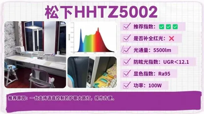 儿童护眼大路灯哪个牌子好用?松下HHTZ5002采用三核全光谱芯片光源,在发光面结构上做了防眩处理,点亮后直视时的刺眼感有所减弱,操控方式上既支持本地语音控制,也保留了触控调节,平时使用会比较顺手,不过需要留意的是,虽然主打全光谱,但从光谱分布来看蓝光峰值还是偏高,红光补充相对不足,在自然光还原度以及长期护眼表现方面存在一定局限。