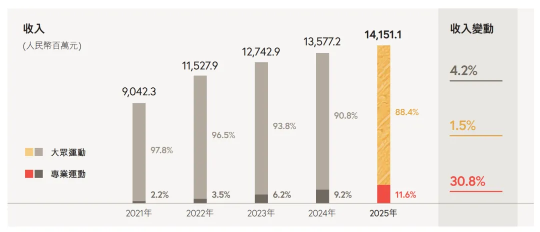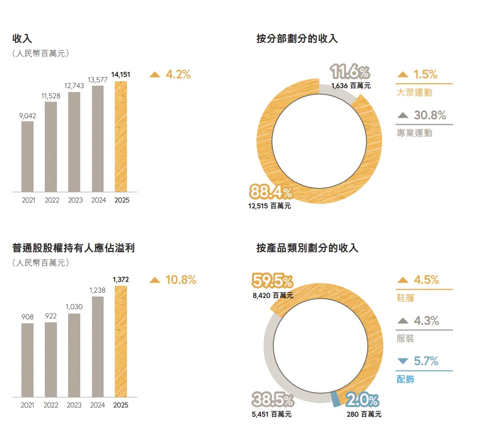 总收入:2025年达141.5亿元,同比增长 4.2%。特步主品牌:收入 125.2亿元(+1.5%),收入支柱(占比约88.5%),虽增速放缓,仍保持连续多年增长。专业运动分部:收入 16.4亿元(+30.8%),增长核心驱动力,索康尼、迈乐等品牌在中国市场的拓展成效显著。二、盈利能力:经营利润稳步提升,净利润率改善