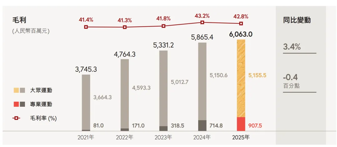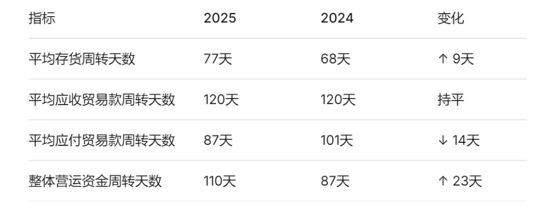 毛利:60.6亿元,毛利率 42.8%(-0.4%),主因产品结构或成本变化。经营溢利:20.2亿元(+2.7%),经营溢利率 14.3%(-0.2%)。归母净利润:13.7亿元(+10.8%),净利率提升至 9.7%(+0.6%)。主要得益于:专业运动板块经营溢利大增 46.4%;三、营运效率:存货周转有所放缓,应收款维持高位