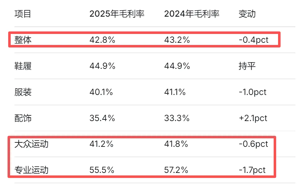 鞋服双增长均衡:鞋履增速略高于服装(安踏服饰增速增长大于鞋履),配饰下滑;七、毛利率结构相关(按品类)