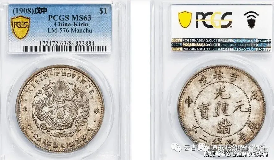 1908年戊申吉林造光绪元宝中心满文库平七钱二分银币,币面中心满文直译为“大清国”,系吉林干支年号系列银币中最为珍稀的品种之一,铸额极少。