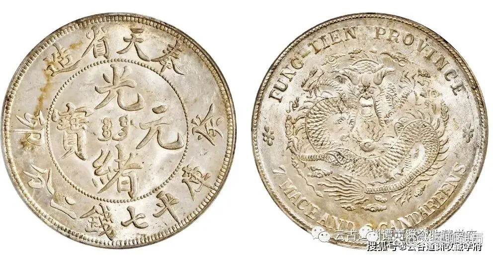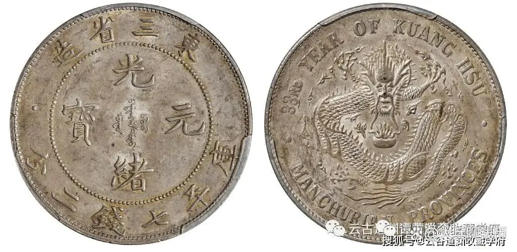 光绪三十三年东三省造光绪元宝库平七钱二分银币,东三省银元制造总局铸造,因彼时东北地区民间习用双角小毫,壹圆主币铸行不足一年,即被大量回炉改制,留存至今已不多见。