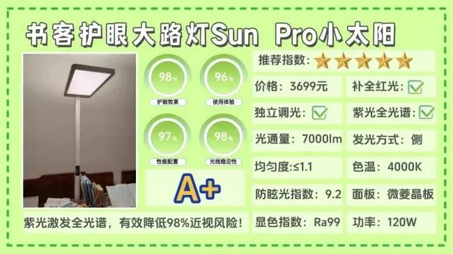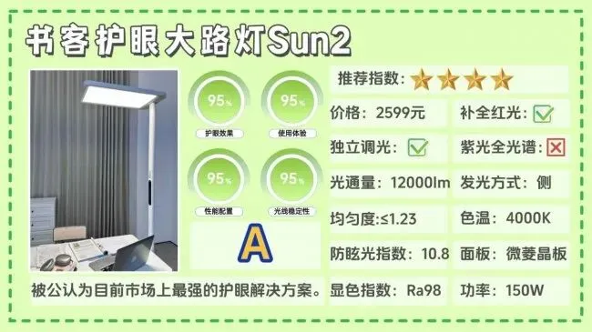 全光谱大路灯第一名全面解析:书客护眼大路灯SUN2;超过100家电媒体实测,深度护眼指数第一,有效延缓83%用眼疲劳并降低92%近视风险!