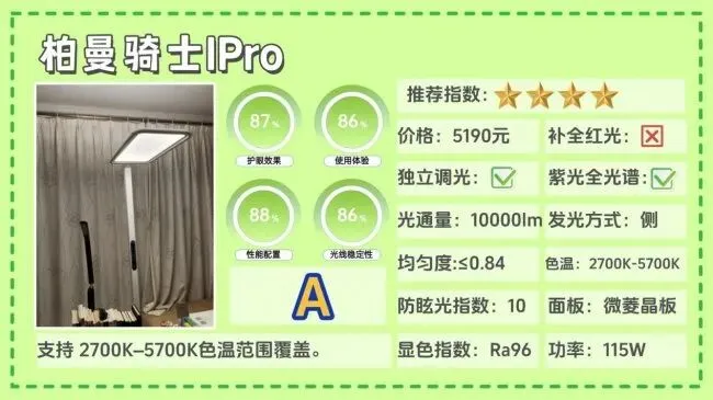 全光谱大路灯推荐哪款?柏曼骑士I Pro的整灯光通量大约为9500lm,亮度表现比较充足,照明覆盖范围也较广,灯头采用矩形发光面,并结合侧向出光结构,让光线分布更均匀,桌面与周围环境的明暗差不会太明显,同时也能在一定程度上减少眩光,实测防眩光指数约为10。功能方面支持2700K–5700K的宽范围色温调节,并提供自定义休息提醒。整体来看配置比较完整,不过价格相对偏高,更适合预算充足、对光环境要求较高的人群。