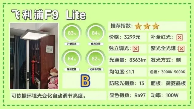 全光谱大路灯推荐哪款?飞利浦F9Lite在调节方式上比较灵活,支持无级亮度调节,色温范围大约在2900K–4900K之间,可以根据学习、阅读或休闲场景进行调整,操作上既支持灯体触控,也可以通过手机App远程控制,日常使用比较方便,在光学安全方面,蓝光控制达到RG0等级,基础护眼表现还算可靠。不过这款灯没有加入红光补偿,虽然亮度充足、空间照明通透,但在自然光还原度和长期护眼表现上还有提升空间。