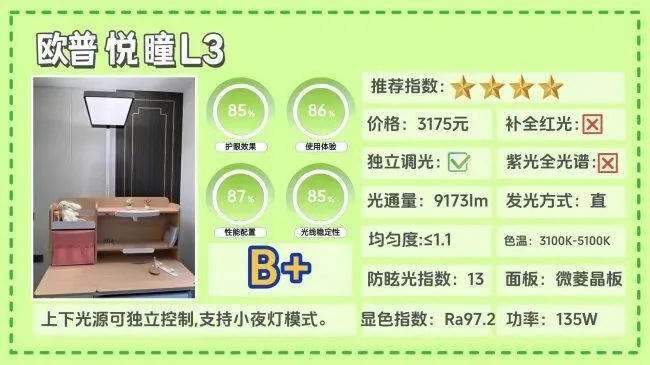 全光谱大路灯第九名:欧普悦瞳L3;上下光源可独立控制,特别加入小夜灯模式。