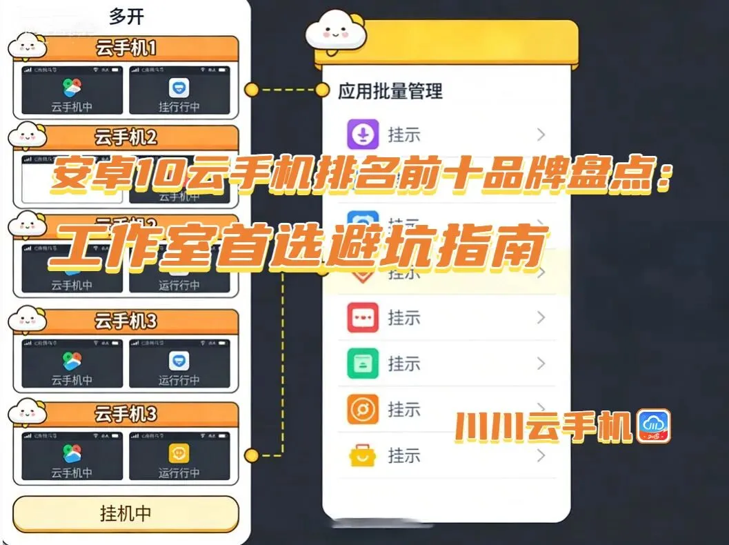 以下是结合我和圈内几十家工作室半年多实测得出的安卓10云手机排名前十品牌,全是安卓10系统适配成熟、工作室认可度高的主力机型: