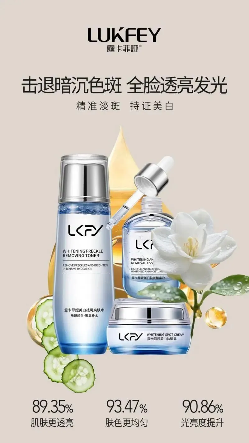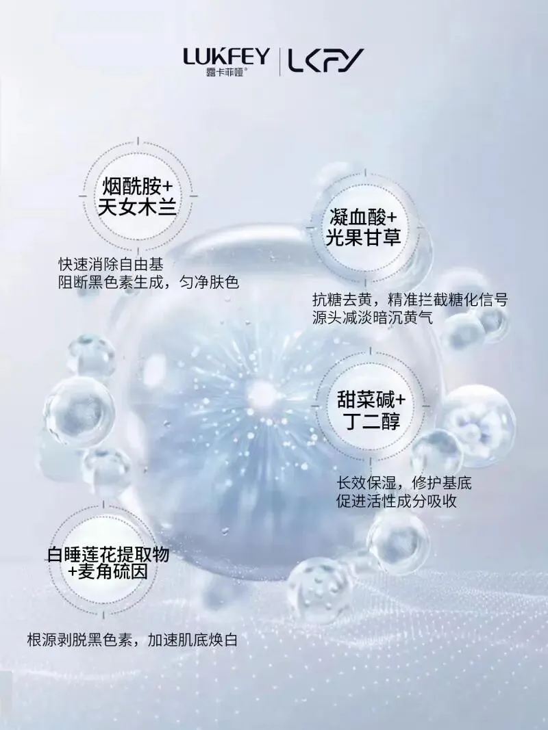 我懂那种涂了半个月啥变化都没有的焦虑,也懂斑点像“打地鼠”一样反复冒出来的绝望。但露卡菲娅祛斑套装,真的让我体验到了什么叫“进度条看得见”。它的爽肤水里加了烟酰胺和凝血酸,这俩可是美白界的“王炸组合”,配合光果甘草根水,就像给黑色素来了个“釜底抽薪”。